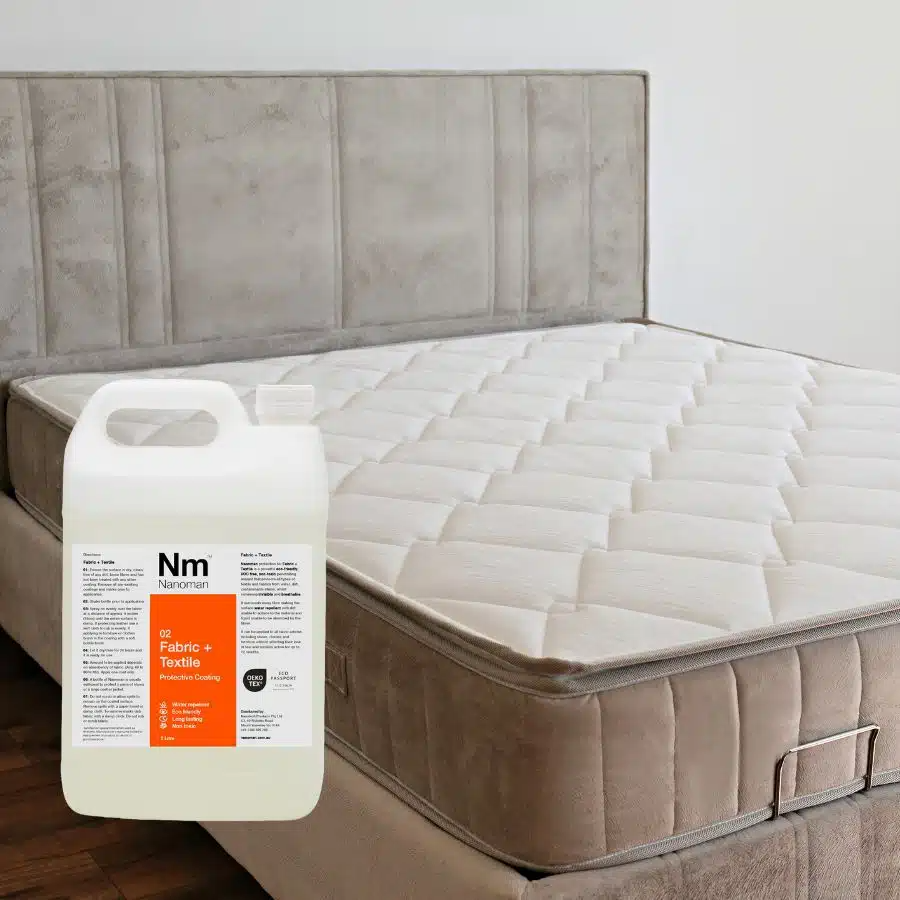 Fabric waterproof coating. Fabric stain protection. Quick and easy spray application to provide superior fabric protection. Waterproof fabrics without affecting the look or feel of the fabric. Suitable for all fabrics and textiles including cotton, leather, polyester, wool and silks. Ideal couch, rugs, upholstery and carpet fabric waterproofing protection. Water repellent coating – liquids will not permeate the textile. Totally invisible. Fabric water repelling preventing stains and soiling. Non toxic, eco friendly formulation that is harmless to skin. OEKO-TEX ECO PASSPORT. PFAS and alcohol free, ecofriendly formulation. Perfect fabric protection for furniture, carpets and rugs. Can be used indoors and outdoors. Contains No PFAS or PFOS (Forever Chemical Free).